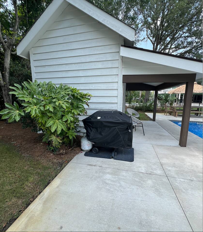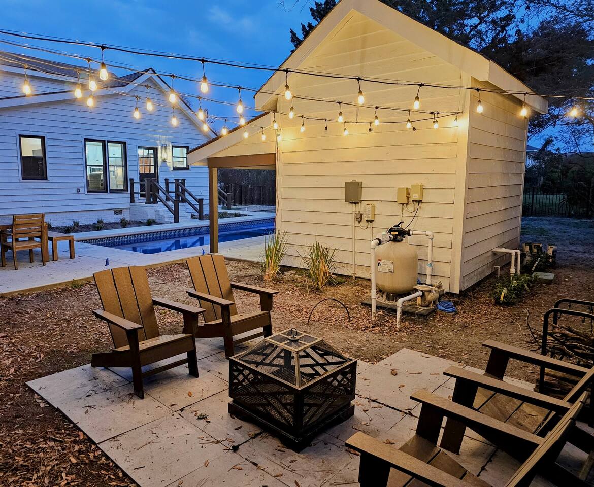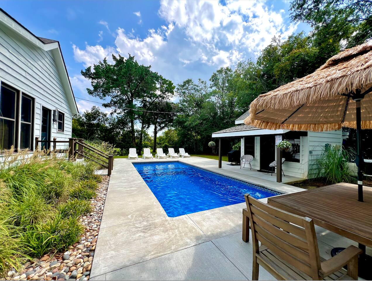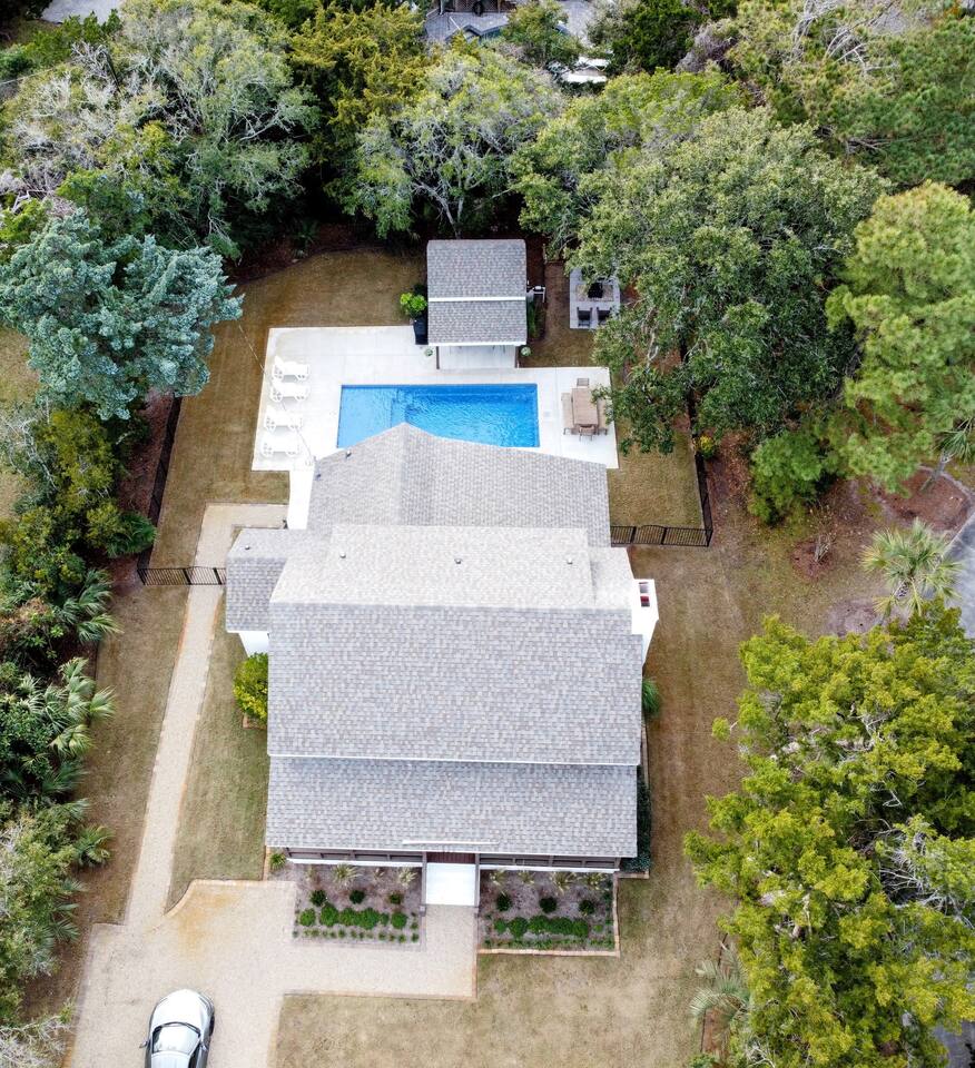 We provide all of your basic needs and more. This is one of the things that sets us apart from the other area rentals. We love to take care of our guests and want you to enjoy our home and southern hospitality. * Complimentary snacks, coffee pods, coffee filters, and paper towels to get you going. * Fresh bed linens for each bed are included in the base rental price. All beds will be made up prior to your arrival. * Each bedroom has 2 luggage racks, 2 phone / device charging stations, TV with remote control. * Bath towel, hand towel, and wash cloth for each guest. Kitchen towel set is also provided. We do NOT provide beach towels. * Each full bath has complimentary toiletries. * The kitchen is fully equipped and includes a toaster, blender, hand mixer, electric can opener, tea pot, Keurig coffee maker (brews pods and ground coffee), cocktail shaker, bar tools, cutting boards, cooling racks, baking sheets, mixing bowls, pots and pans, storage containers, pot holders and mits, and a wide assortment of cooking utensils. * Dishwashing tabs, soap, and paper towels to get you started are provided. * Household cleaning items are available for use and stored under the kitchen cabinets. * There a variety of board games, puzzles, and playing cards for all ages stored in the family room. * In the laundry room there is a vacuum, broom, swiffers, fly swatters, ironing board, iron, and first aid kit, as well as NEW full sized washer and dryer. * All closets have hangers * Firewood for the fire pit *Lounge chairs on pool deck *Dining table outside that seats 8 *BBQ grill *Pool house with beach cart, cooler, boogie boards, floats, sand toys, and 6 beach chairs The pool area is very safe for families with children. There are secure gates and fencing enclosing the backyard and warning alarms are on all first floor windows and doors facing the pool. The pool is not heated but is open year round. In the back of the yard is the fire pit area with Adirondack chairs and overhead patio lighting. Some wood to get you started is provided so don't forget to bring the S'mores! The yard is landscaped with assorted tropical plants and various sea grasses so you will truly feel like you’re in Shangra-la ! NO PARTIES! NO SMOKING! NO PETS! Swim diapers are REQUIRED for infants and toddlers NO driving or parking on the grass NO moving or rearranging furniture/decor NO air mattresses are allowed Checkin time is 4 PM. Checkout time is 10 AM. Early checkin or late checkout, if available, can be provided at an additional cost and must be approved in advance. Arriving prior to your checkin time is NOT allowed. This includes parking in the driveway, unloading your vehicle, sitting on the porch, or entering the backyard.