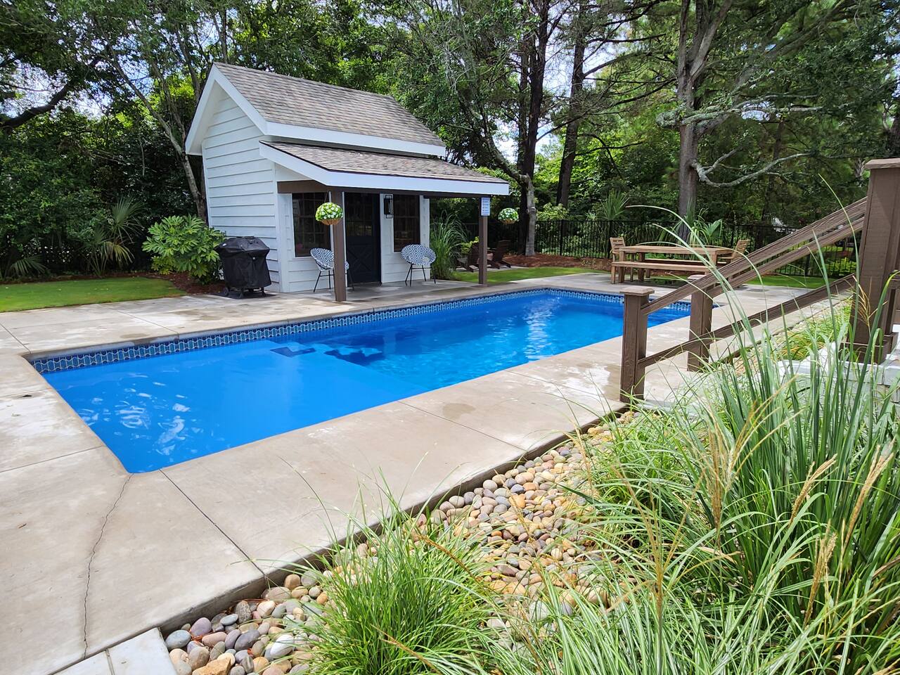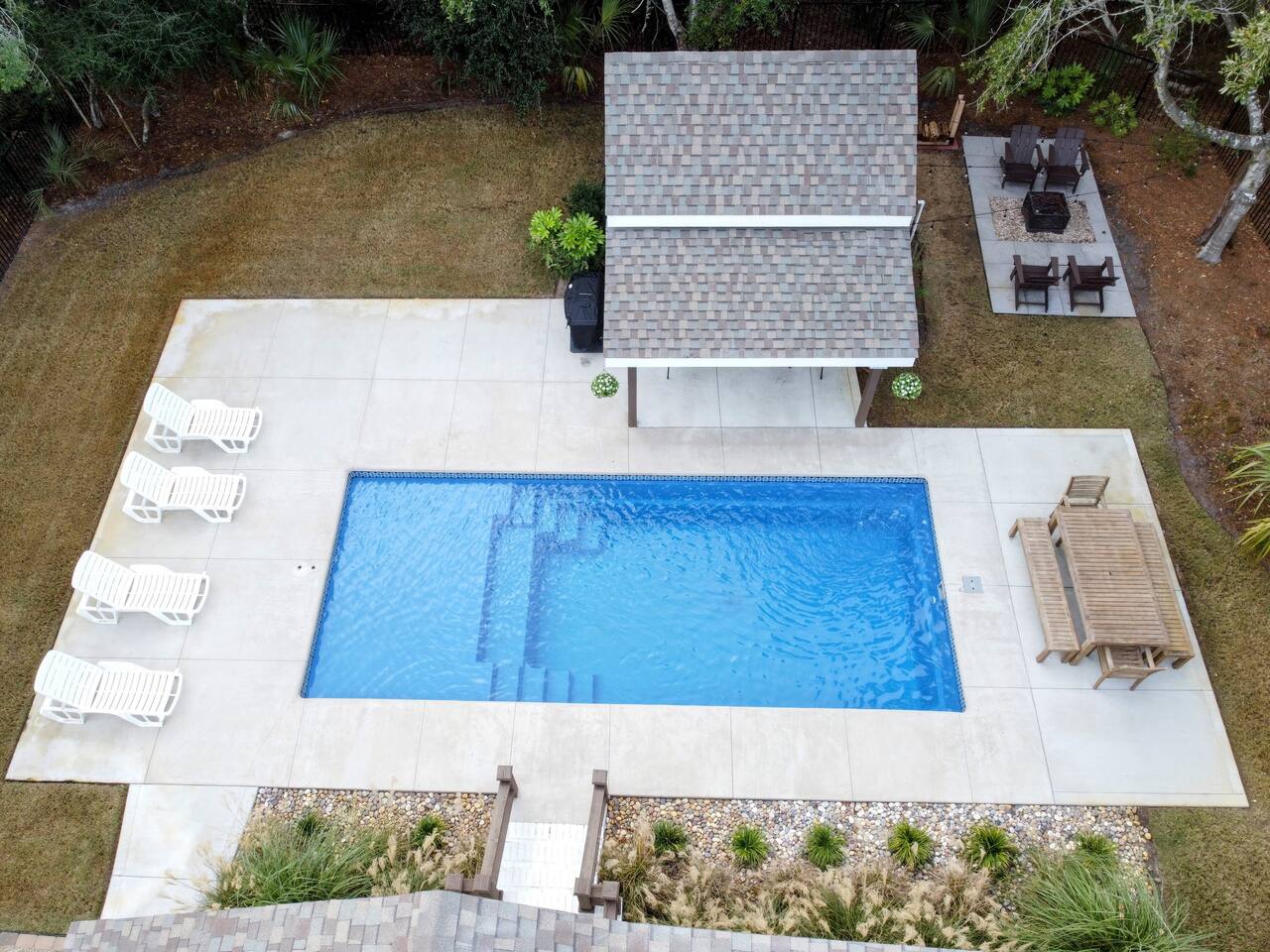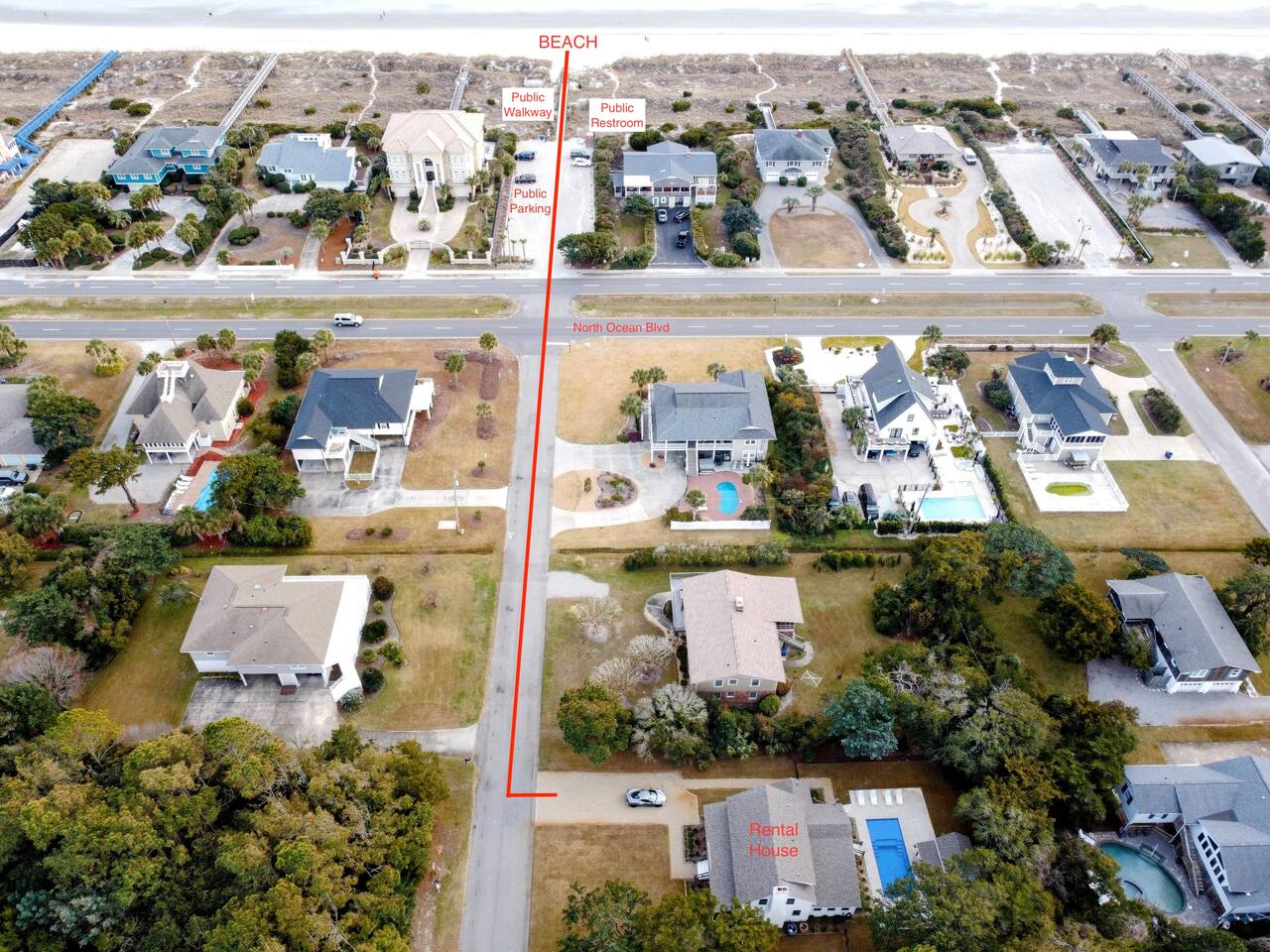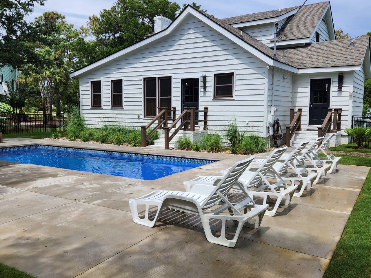 We provide all of your basic needs and more. This is one of the things that sets us apart from the other area rentals. We love to take care of our guests and want you to enjoy our home and southern hospitality. * Complimentary snacks, coffee pods, coffee filters, and paper towels to get you going. * Fresh bed linens for each bed are included in the base rental price. All beds will be made up prior to your arrival. * Each bedroom has 2 luggage racks, 2 phone / device charging stations, TV with remote control. * Bath towel, hand towel, and wash cloth for each guest. Kitchen towel set is also provided. We do NOT provide beach towels. * Each full bath has complimentary toiletries. * The kitchen is fully equipped and includes a toaster, blender, hand mixer, electric can opener, tea pot, Keurig coffee maker (brews pods and ground coffee), cocktail shaker, bar tools, cutting boards, cooling racks, baking sheets, mixing bowls, pots and pans, storage containers, pot holders and mits, and a wide assortment of cooking utensils. * Dishwashing tabs, soap, and paper towels to get you started are provided. * Household cleaning items are available for use and stored under the kitchen cabinets. * There a variety of board games, puzzles, and playing cards for all ages stored in the family room. * In the laundry room there is a vacuum, broom, swiffers, fly swatters, ironing board, iron, and first aid kit, as well as NEW full sized washer and dryer. * All closets have hangers * Firewood for the fire pit *Lounge chairs on pool deck *Dining table outside that seats 8 *BBQ grill *Pool house with beach cart, cooler, boogie boards, floats, sand toys, and 6 beach chairs The pool area is very safe for families with children. There are secure gates and fencing enclosing the backyard and warning alarms are on all first floor windows and doors facing the pool. The pool is not heated but is open year round. In the back of the yard is the fire pit area with Adirondack chairs and overhead patio lighting. Some wood to get you started is provided so don't forget to bring the S'mores! The yard is landscaped with assorted tropical plants and various sea grasses so you will truly feel like you’re in Shangra-la ! NO PARTIES! NO SMOKING! NO PETS! Swim diapers are REQUIRED for infants and toddlers NO driving or parking on the grass NO moving or rearranging furniture/decor NO air mattresses are allowed Checkin time is 4 PM. Checkout time is 10 AM. Early checkin or late checkout, if available, can be provided at an additional cost and must be approved in advance. Arriving prior to your checkin time is NOT allowed. This includes parking in the driveway, unloading your vehicle, sitting on the porch, or entering the backyard.